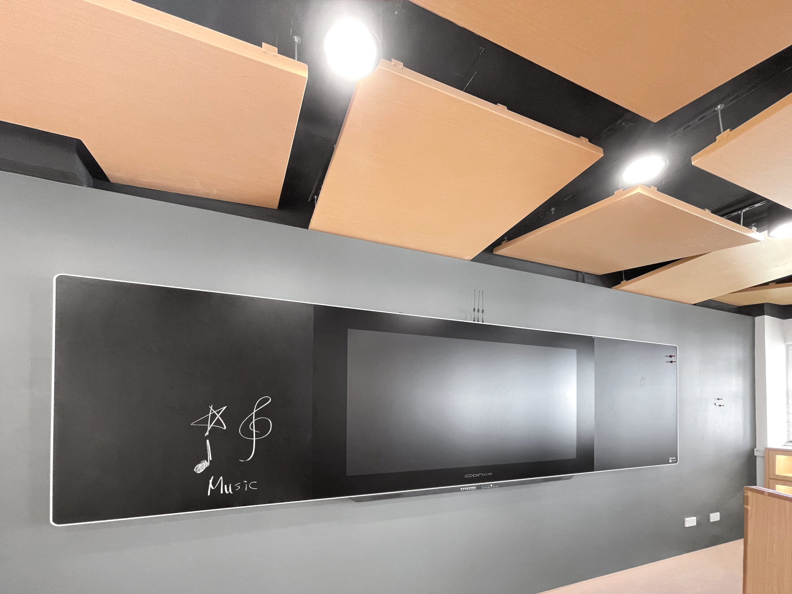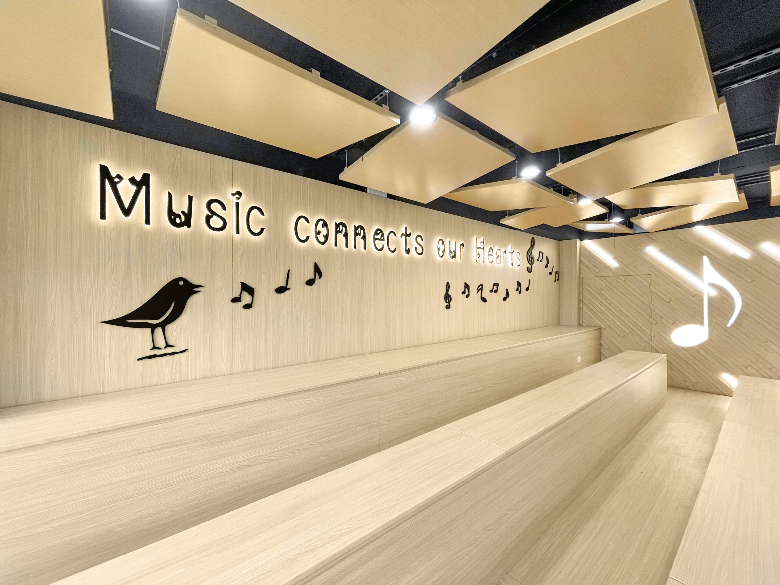學校想打造一個具演奏廳感覺而又適合小朋友的音樂室,彼劃利用起伏的天花和台階等演奏廳元素,加上活潑動感的音符燈飾和塗鴉外牆,還在外牆上添置了真實的樂器供路過的同學隨意把玩,可引起同學們對音樂的興趣。